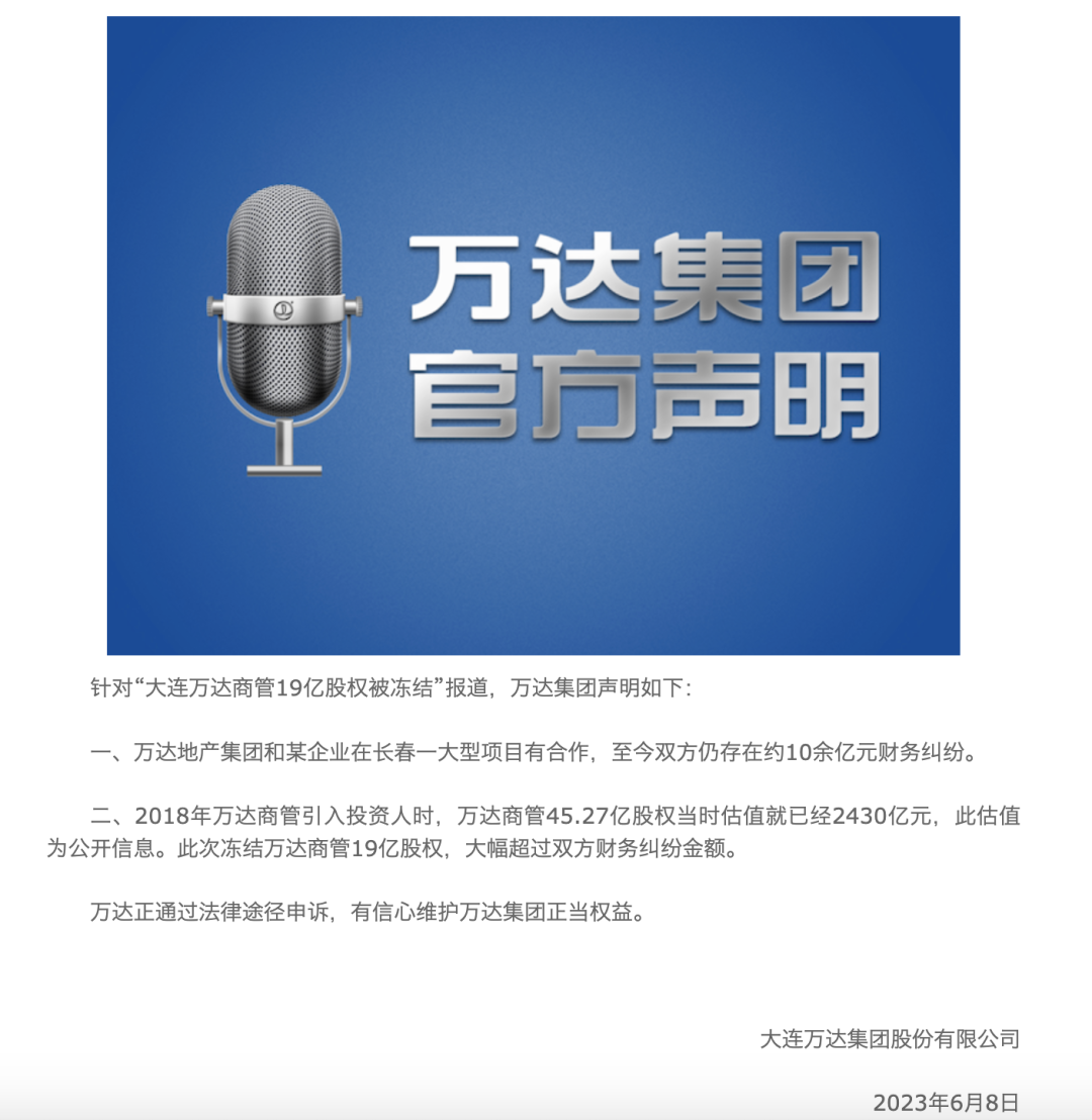 6月8日,针对“大连万达商管19亿股权被冻结”一事,大连万达集团发布了声明。