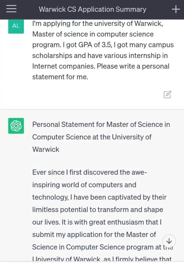 “自我初次涉猎计算机领域,踏入这个令人敬畏的世界以来,我被它改变和塑造生活的无限潜力而深深吸引。我怀着极大的热忱,向华威大学计算机科学硕士项目提出申请。”AI写的开头,颇令人眼前一亮。