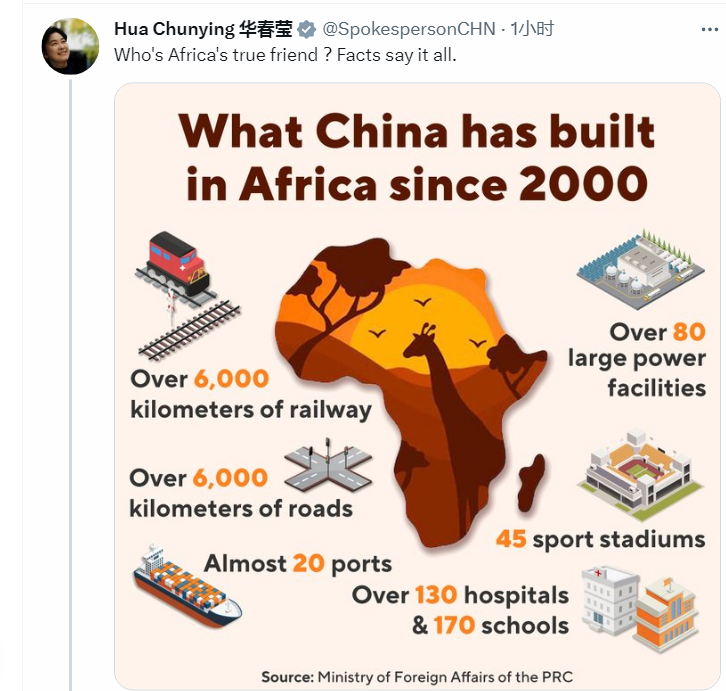 中国自2000年以来在非洲做出哪些建设:超过6000公里铁路、超过6000公里公路、80多个大型电力设施、45个体育场馆、近20个港口、超过130家医院和170所学校。