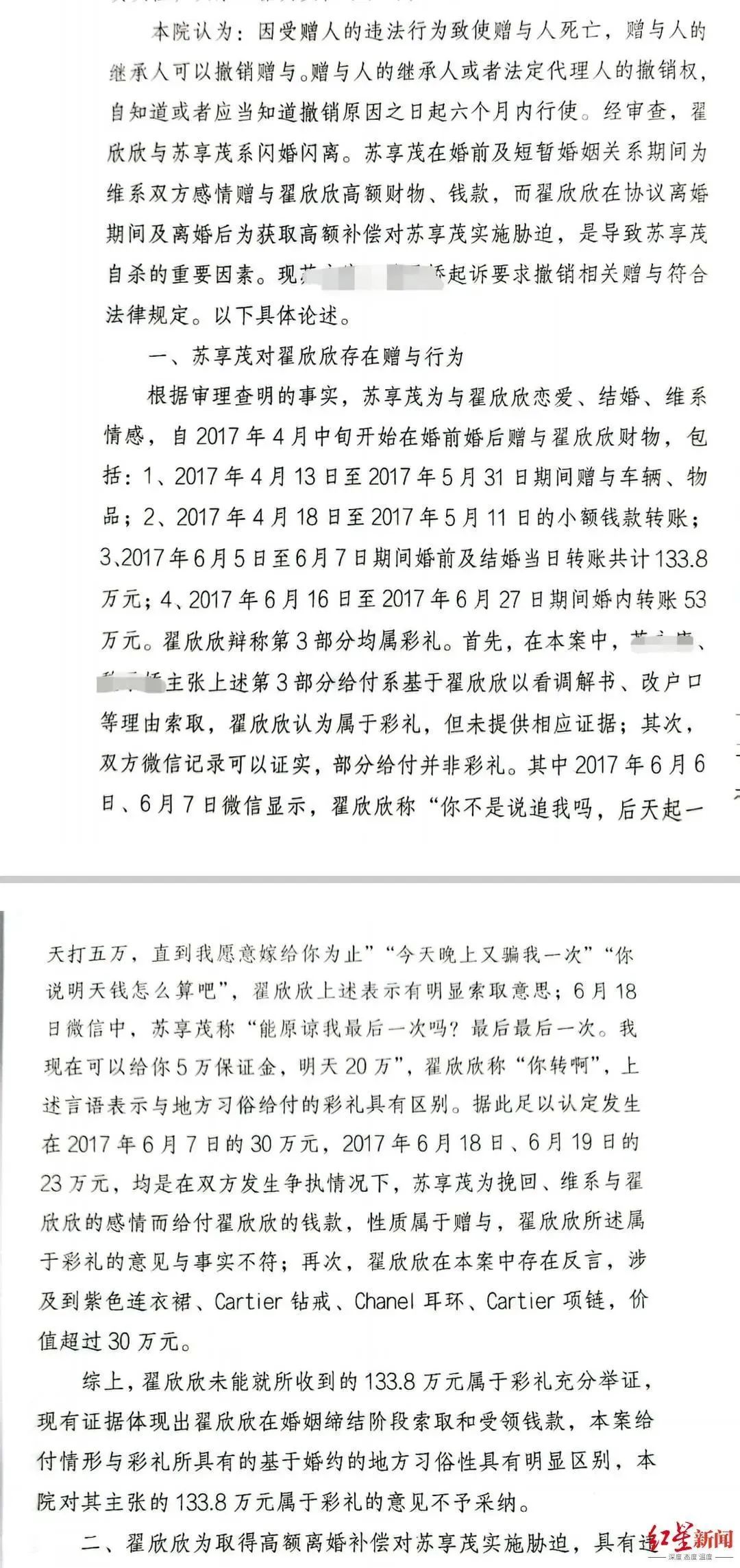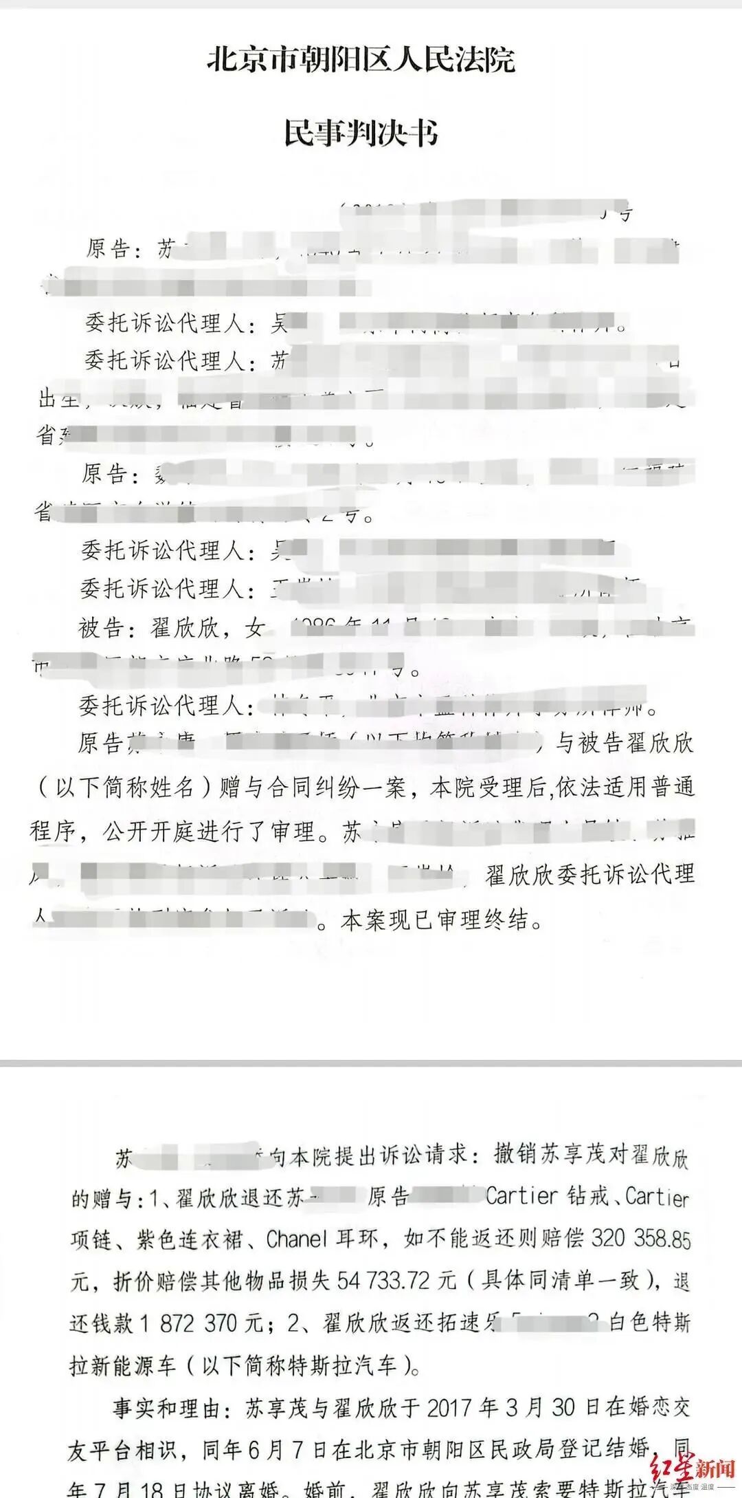 此外,赠予合同纠纷一案判决书显示,根据审理查明的情况,翟欣欣与苏享茂相识至协议离婚仅110余天,期间收受苏享茂赠与的车辆、物品、款价值超过300万元,婚恋过程具有明显的经济特征。
