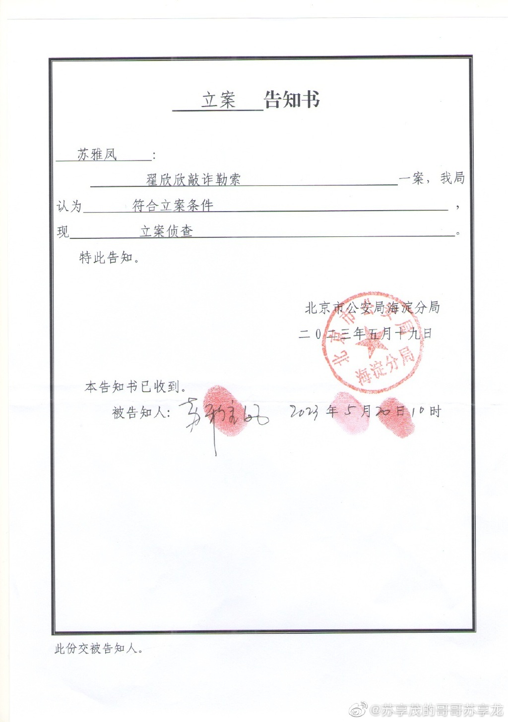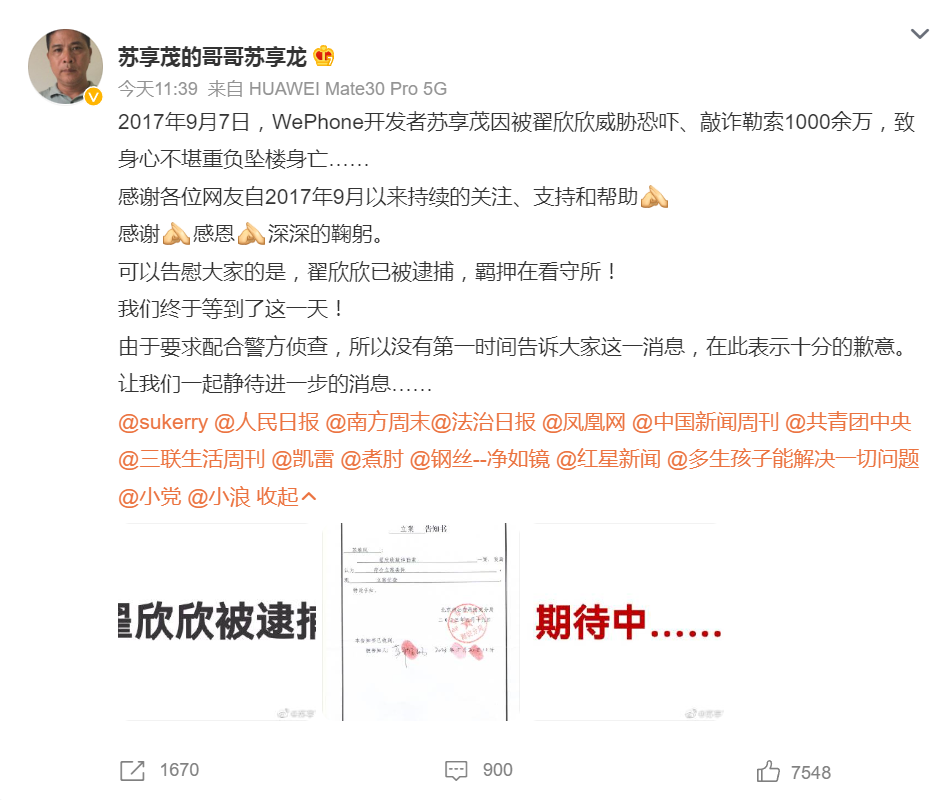 2017年9月,程序员苏享茂在家中跳楼自杀,留下“妻子索要千万逼死丈夫”的控诉。事发5年多之后,2023年6月9日,@苏享茂的哥哥苏享龙 通过个人微博称,翟欣欣已被逮捕,羁押在看守所。苏享茂提供的加盖北京海淀区公安局公章的立案通知书显示,翟欣欣敲诈勒索一案,该局认为符合立案条件,现立案侦查。