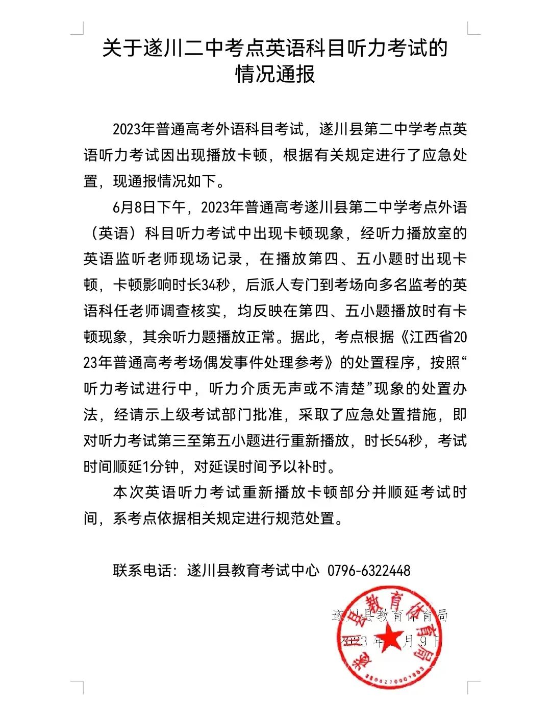 通报称,6月8日下午,2023年普通高考遂川县第二中学考点外语(英语)科目听力考试中出现卡顿现象,经听力播放室的英语监听老师现场记录,在播放第四、五小题时出现卡顿,卡顿影响时长34秒,后派人专门到考场向多名监考的英语科任老师调查核实,均反映在第四、五小题播放时有卡顿现象,其余听力题播放正常。据此,考点根据《江西省2023年普通高考考场偶发事件处理参考》的处置程序,按照“听力考试进行中,听力介质无声或不清楚”现象的处置办法,经请示上级考试部门批准,采取了应急处置措施,即对听力考试第三至第五小题进行重新播放,时长54秒,考试时间顺延1分钟,对延误时间予以补时。