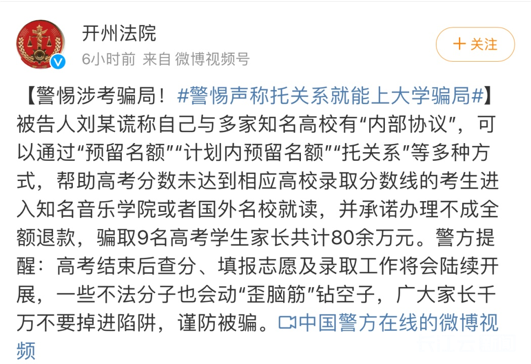 此前,北京市第一中级人民法院网曾公布了一起涉考诈骗案件,被告人刘某谎称自己与多家知名高校有“内部协议”,可以通过“预留名额”“计划内预留名额”“托关系”等多种方式,帮助高考分数未达到相应高校录取分数线的考生进入知名音乐学院或者国外名校就读,并承诺办理不成全额退款。