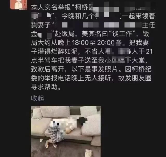 截图中提到,柯桥区某政府机关领导,带着其下属金某和另一单位的几名政府工作人员吃饭时,以“谈工作”为由,将金某灌醉。之后,该领导于当晚9:30将金某送回所住小区楼下大堂,致歉后离开。