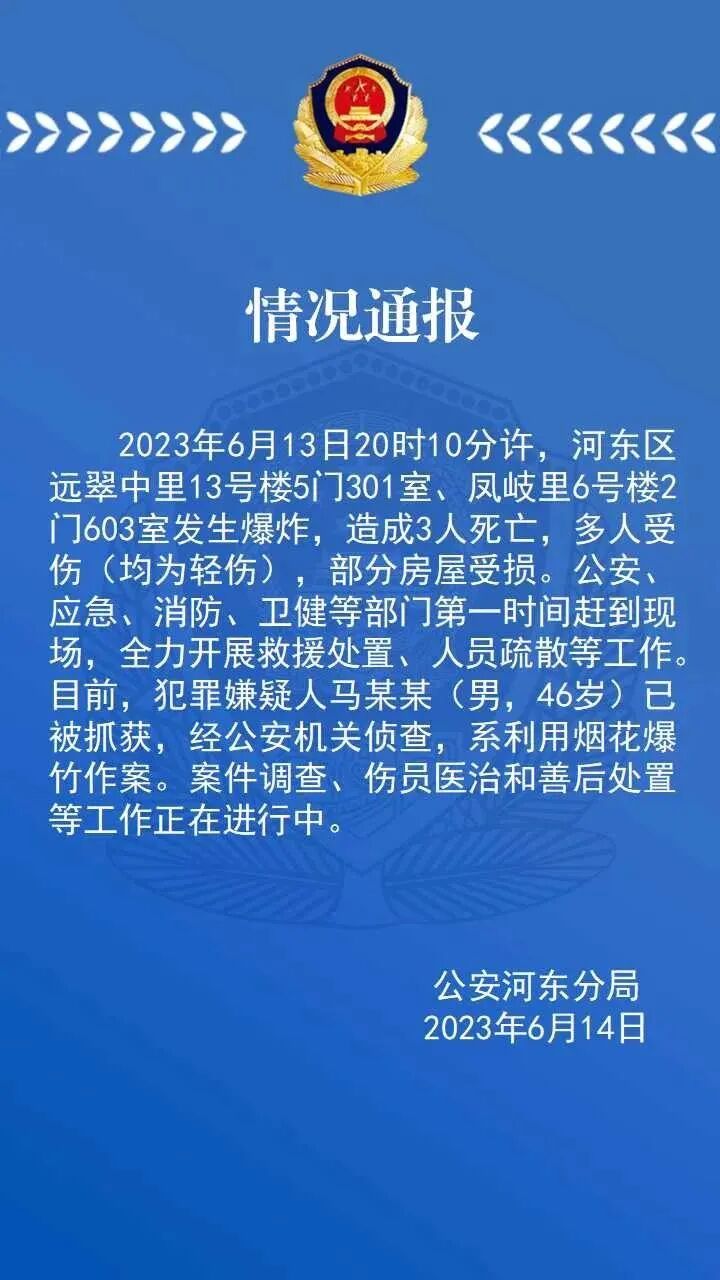 2023年6月13日20时10分许,河东区远翠中里13号楼5门301室、凤岐里6号楼2门603室发生爆炸,造成3人死亡,多人受伤 (均为轻伤),部分房屋受损。公安、应急、消防、卫健等部门第一时间赶到现场,全力开展救援处置、人员疏散等工作。