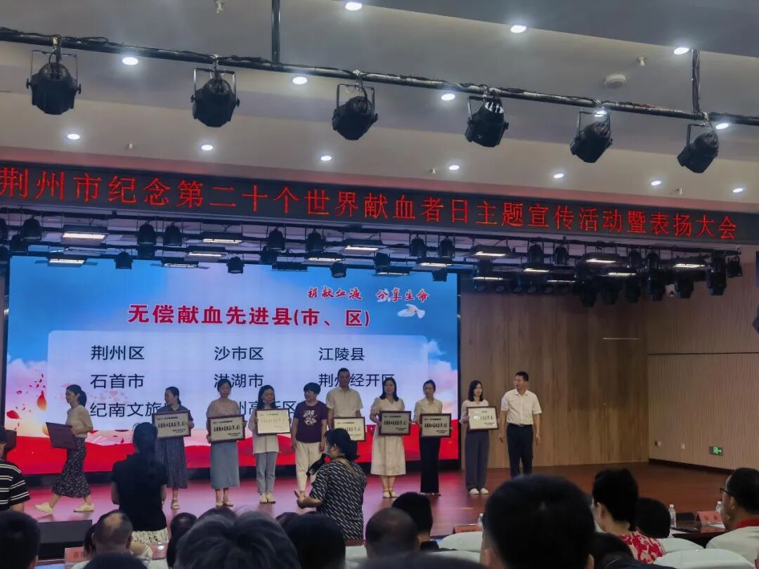 6月12日,全市举办纪念第二十个世界献血者日主题宣传活动,表彰2021 -2022 年度无偿献血先进县 (市、区)、先进乡(镇、管理区、街道)、先进单位和先进个人,沙市区再次荣获“全市无偿献血先进区”称号。