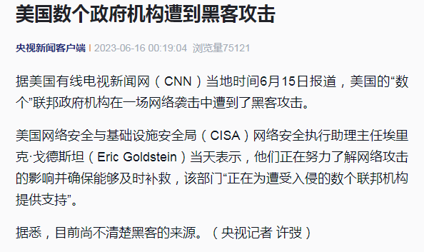 据央视新闻客户端援引美国有线电视新闻网(CNN)当地时间6月15日报道,美国的“数个”联邦政府机构在一场网络袭击中遭到了黑客攻击。