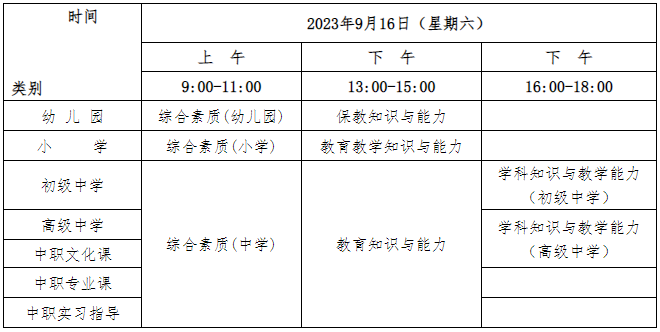3.选择初中、高中、中职文化课类别中“心理健康教育”、“日语”、“俄语”学科的考生,笔试科目三《学科知识与教学能力》暂不考试,结合面试一并考核;选择小学类别中“心理健康教育”、“信息技术”、“小学全科”的考生,笔试科目为《综合素质》(代码:201)和《教育教学知识与能力》(代码:202)。