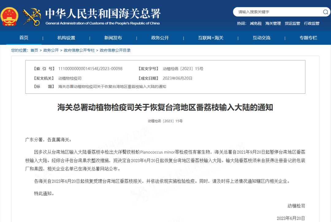 通知指出,各海关自2023年6月20日起恢复受理台湾地区番荔枝报关,并依法依规实施检验检疫。同时,请及时将上述情况通知辖区内相关企业。