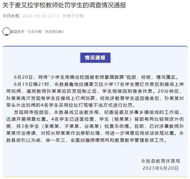 发现网传视频后,永胜县成立由教体局、纪委监委及涉事乡镇组成的工作组,迅速开展调查处置。4名学生已送医检查,学生(杨某某)背部有两处轻微皮外伤痕,另3名学生(李某某、子某某、谷某某)检查无伤情。目前,已对涉事教师孙某某作出停课、对校长柳某某作出停职处理,待进一步调查后将依法依规处置。永胜县将引以为戒、举一反三,全面加强师德师风和教育教学管理各项工作。