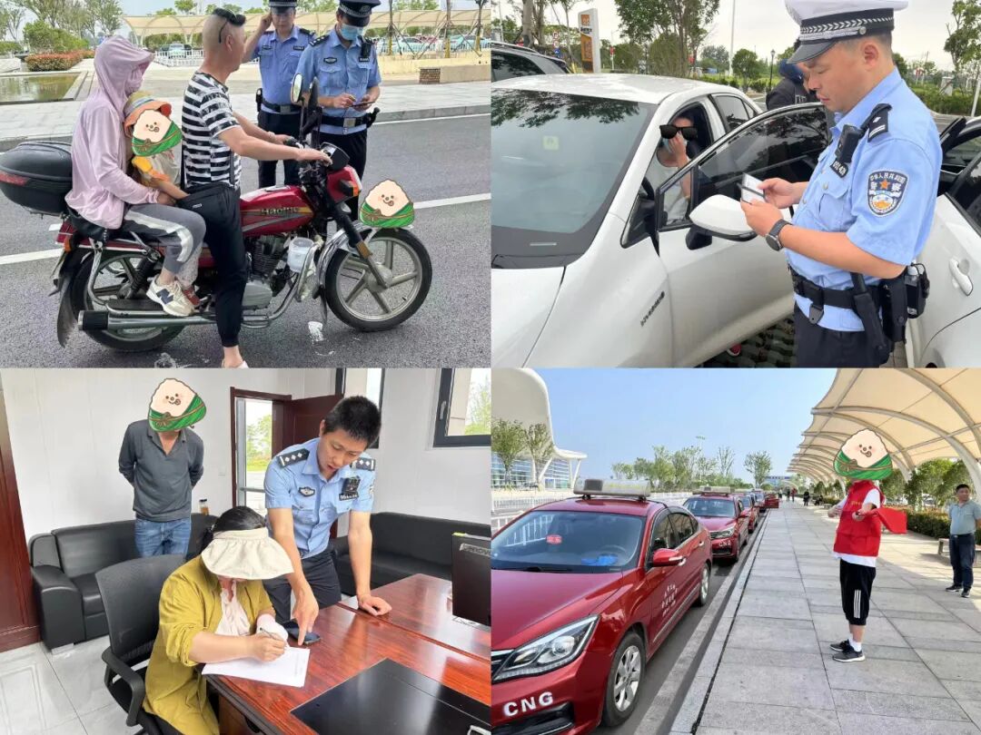 为确保端午节期间辖区道路安全、有序、畅通,营造良好的道路出行环境,机场公安全员上岗,源头设卡管控人流车流,增加重点时段的路面巡防频次,加强对无牌无证、超员载客、违规拉客、酒后驾驶、逆行违停、未佩戴安全头盔等易肇事肇祸交通违法的查处力度,规范出租车、网约车运营秩序,社会车辆停放秩序,组织轻微违法行为人观看交通安全警示片、签订承诺书、当“交通劝导员”。