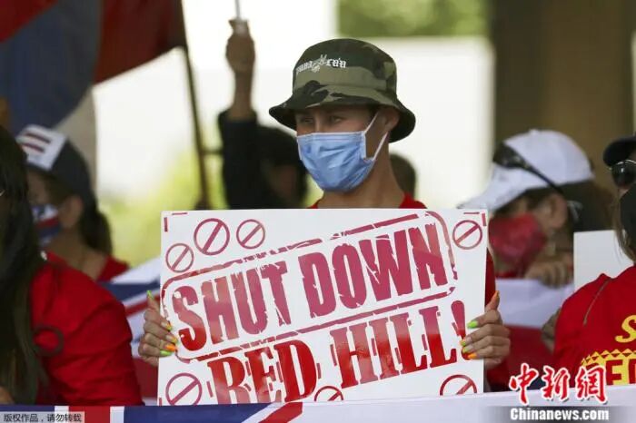 资料图:2022年2月11日,抗议者在夏威夷议会大厦前举着标语,呼吁关闭红山散装燃料储存设施。