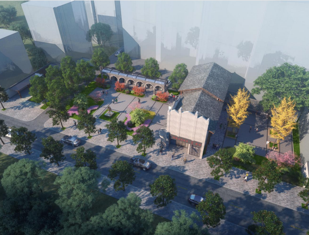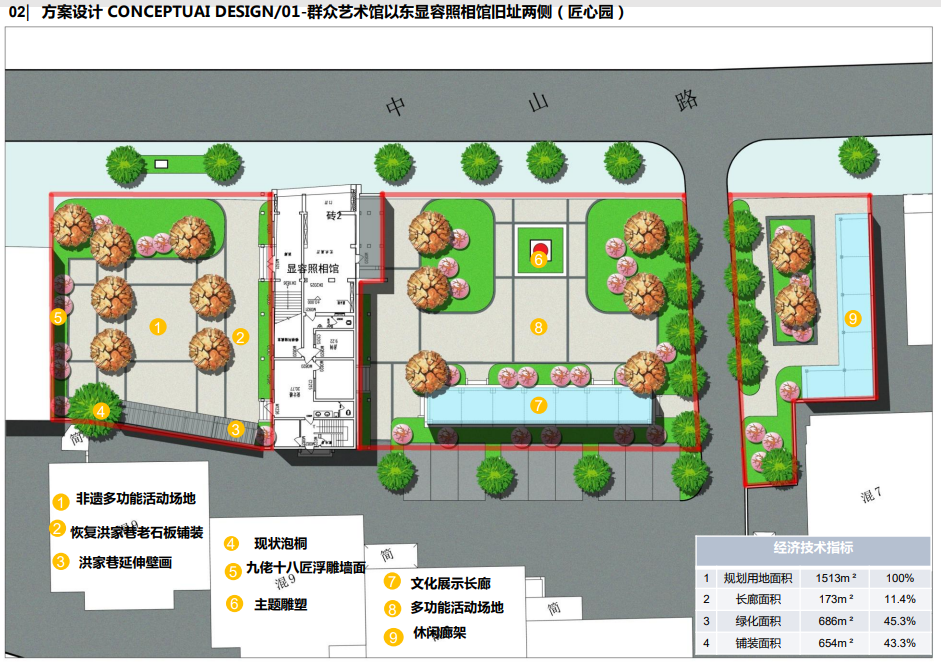 规划对项目用地综合分析后形成两大功能分区,分别为:文化展示办公体验区 、小微公园休闲活动区。