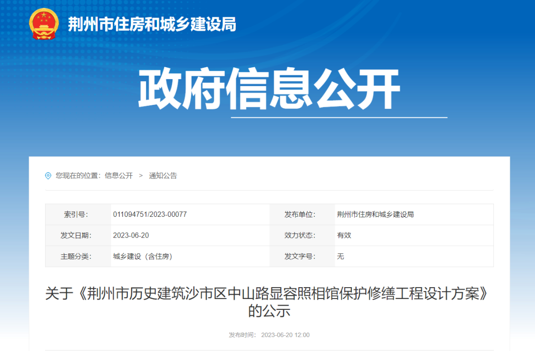 为维护社会公众对我市历史建筑保护修缮工作的知情权和监督权,按照荆州市人民政府《关于印发荆州市中心城区历史建筑修缮管理办法的通知》(荆政发(202214号)的相关要求,现将《荆州市历史建筑中山路显容照相馆保护修缮工程设计方案》进行公示。公示期为2023年6月20日至6月30日(七个工作日)。