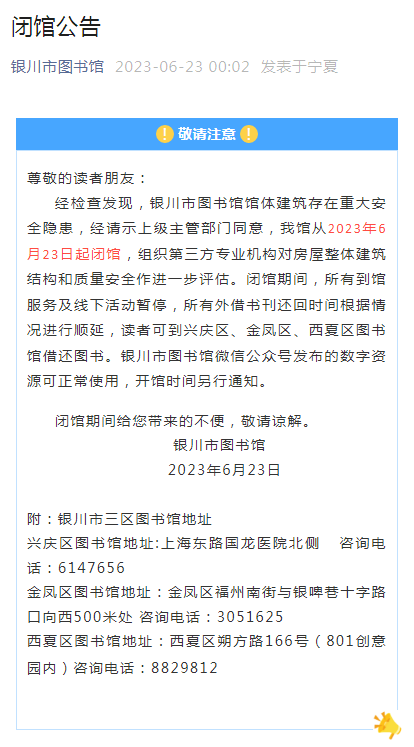 23日,银川市图书馆发布《闭馆公告》:经检查发现,银川市图书馆馆体建筑存在重大安全隐患,经请示上级主管部门同意,我馆从2023年6月23日起闭馆,组织第三方专业机构对房屋整体建筑结构和质量安全作进一步评估。