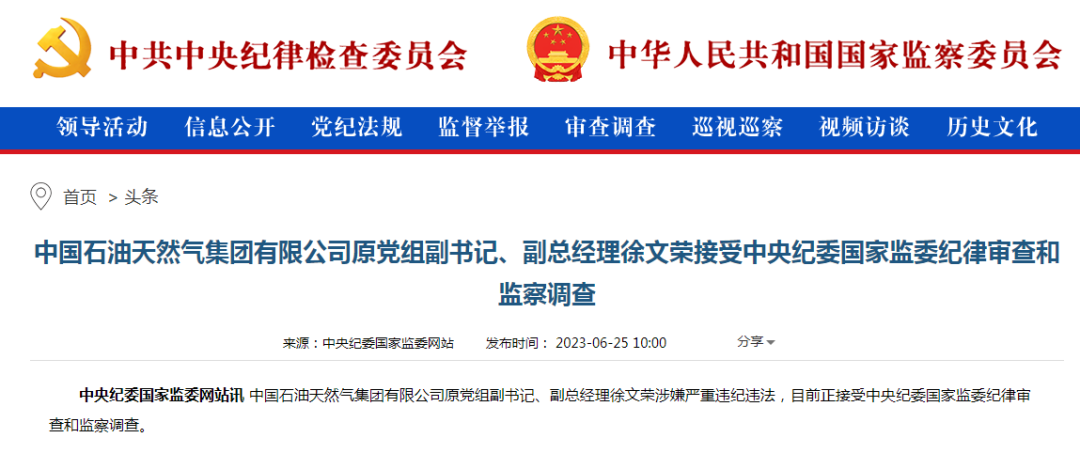 徐文荣,被查! 2023-06-25 11:19 中央纪委国家监委网站 0 据中央纪委国家监委网站25日消息,中国石油天然气集团有限公司原党组副书记、副总经理徐文荣涉嫌严重违纪违法,目前正接受中央纪委国家监委纪律审查和监察调查。