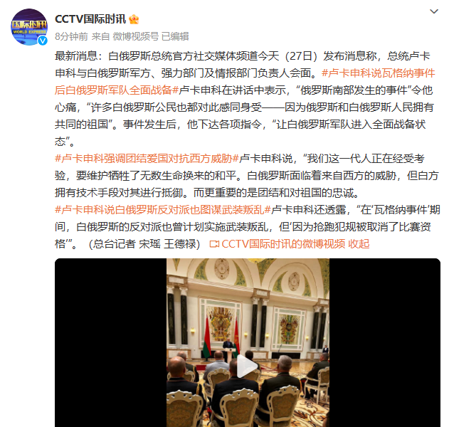 据@CCTV国际时讯报道,白俄罗斯总统官方社交媒体频道27日发布消息称,总统卢卡申科与白俄罗斯军方、强力部门及情报部门负责人会面。卢卡申科在讲话中表示,“俄罗斯南部发生的事件”令他心痛,“许多白俄罗斯公民也都对此感同身受——因为俄罗斯和白俄罗斯人民拥有共同的祖国”。事件发生后,他下达各项指令,“让白俄罗斯军队进入全面战备状态”。