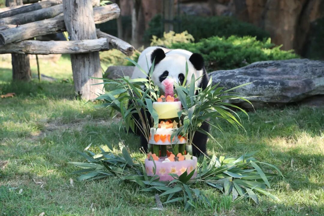 资料图:2018年8月4日,在法国圣艾尼昂市博瓦勒野生动物园,大熊猫宝宝“圆梦”准备品尝“生日蛋糕”。新华社发(博瓦勒动物园供图)