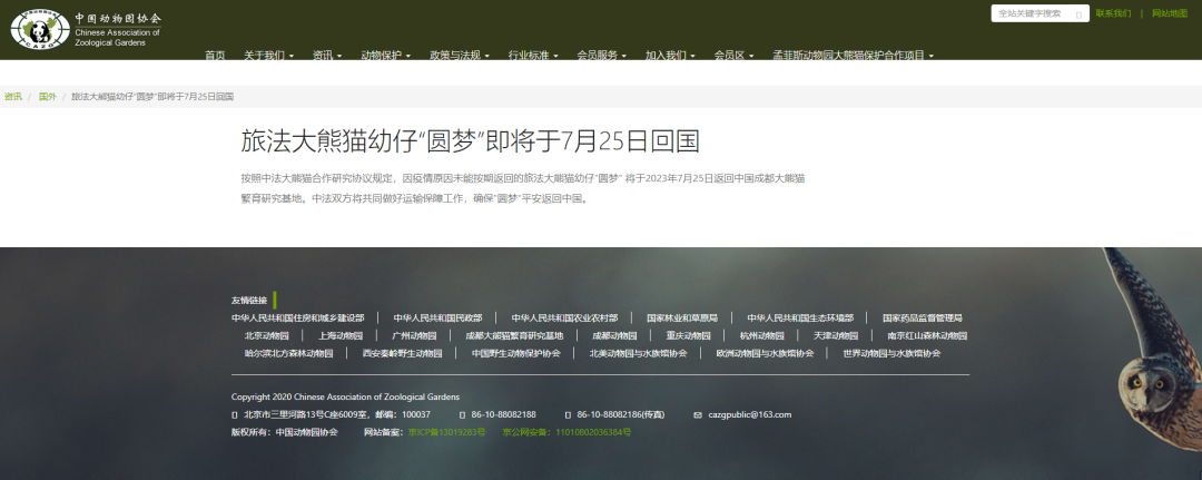 按照中法大熊猫合作研究协议规定,因疫情原因未能按期返回的旅法大熊猫幼仔“圆梦”将于2023年7月25日返回中国成都大熊猫繁育研究基地。中法双方将共同做好运输保障工作,确保“圆梦”平安返回中国。
