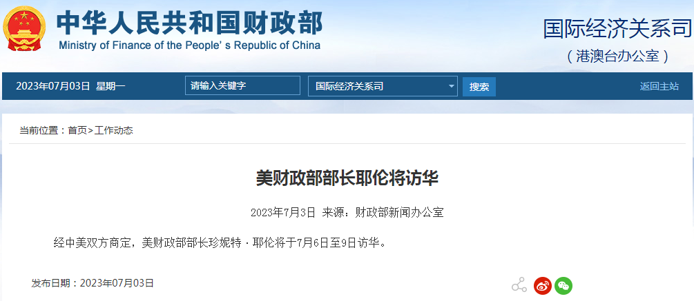 美财政部部长耶伦将访华 2023-07-03 09:38 新华社 0 7月3日,据财政部网站:经中美双方商定,美财政部部长珍妮特·耶伦将于7月6日至9日访华。 耶伦 资料图。(新华社发 马特·麦克莱恩摄)