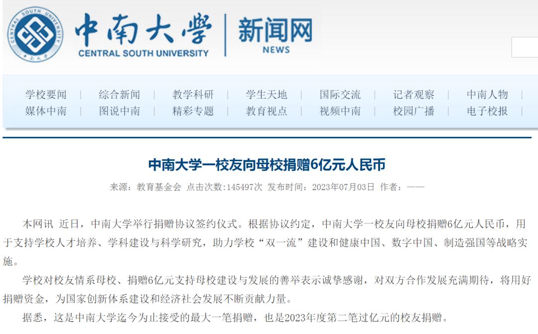 7月3日,中南大学网站发布消息《中南大学一校友向母校捐赠6亿元人民币》: