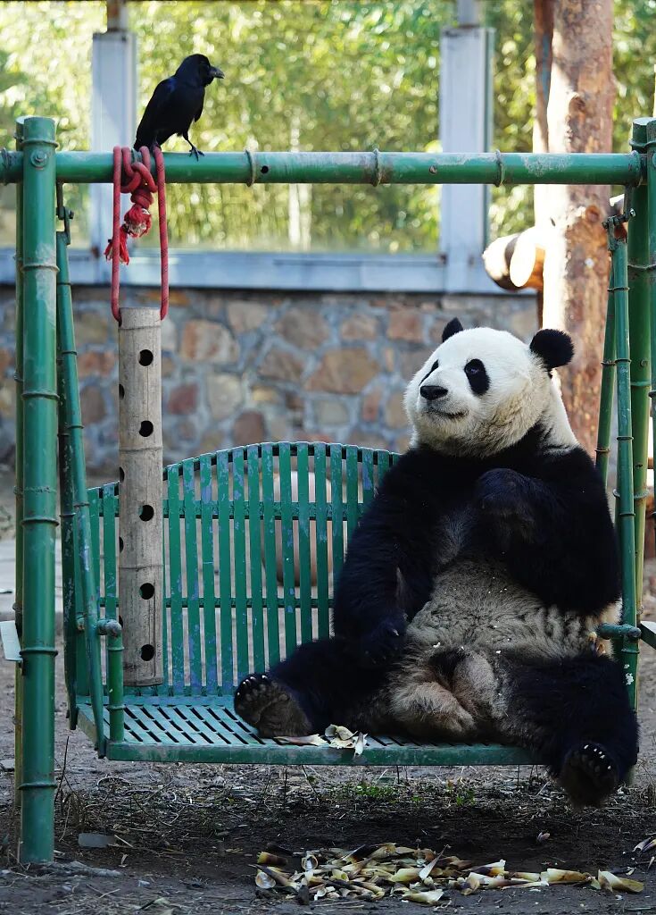 2021年3月14日,北京动物园,大熊猫萌兰和它的小鸟。视觉中国 资料图