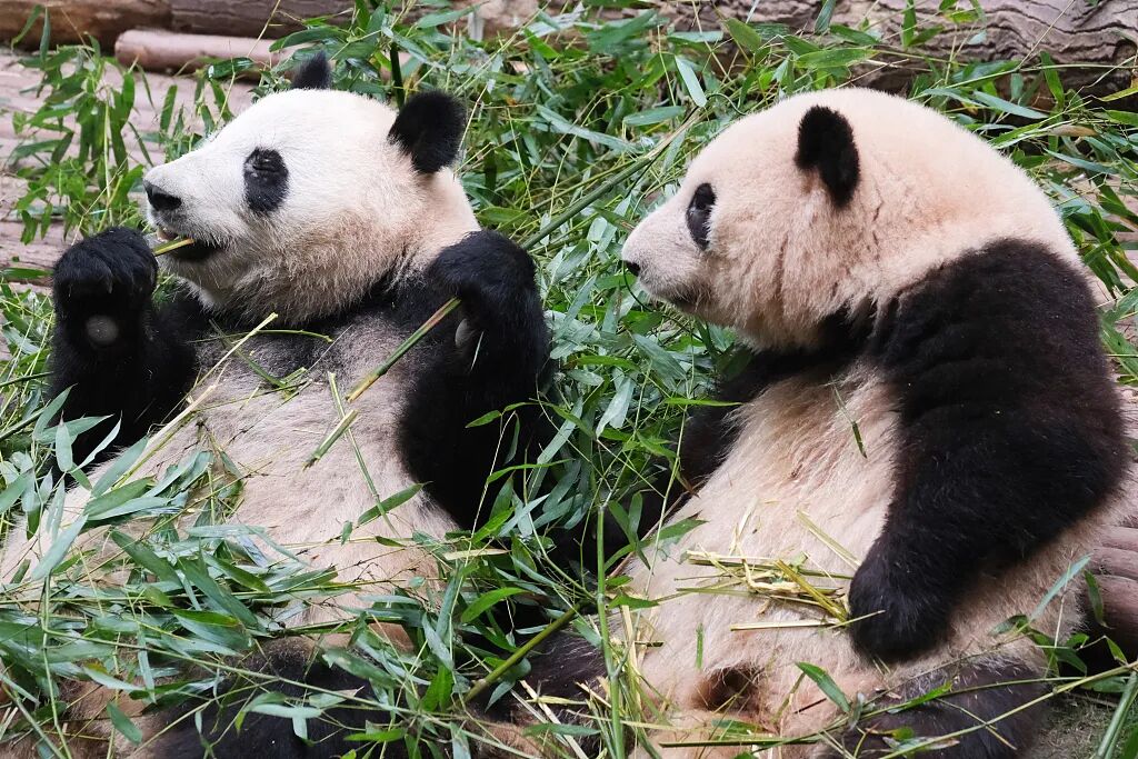 2023年5月27日,成都大熊猫繁育研究基地,大熊猫和花、和叶早起吃竹子。视觉中国 图