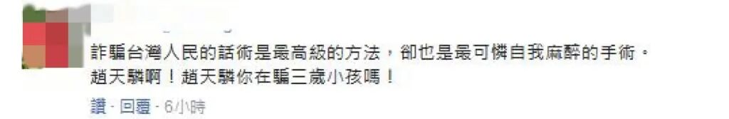 也有台湾网友评论表示“果然是绿色逻辑思维,没有最勇敢,只有最无知!”“赵天麟是在说相声吗?真爱鬼扯!”“诈骗台湾人民的话术是最高级的方法,却也是最可怜自我麻醉的手术!赵天麟啊!赵天麟你在骗三岁小孩吗?”