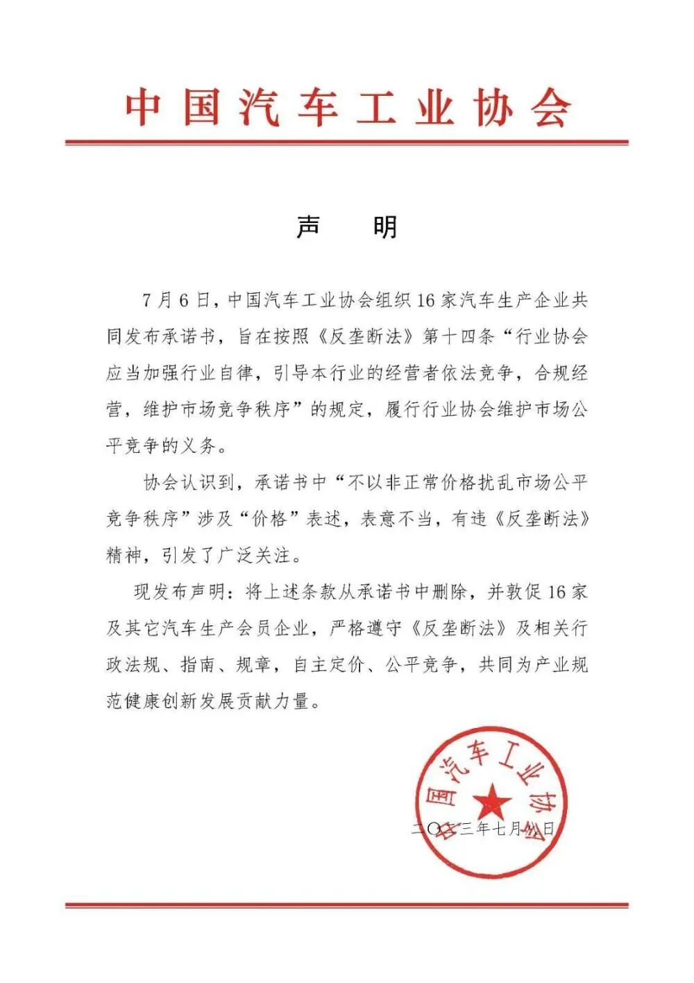 7月8日,中国汽车工业协会官网披露一份声明称,此前组织16家汽车生产企业共同发布的承诺书中涉及“价格”的内容表意不当,有违《反垄断法》精神,现将相关条款从承诺书中删除。