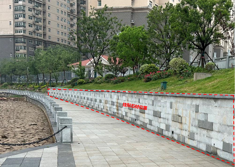 目前,国内采用的通用处理方式主要有石材挂贴、石材湿贴、混凝土预制板材挂贴等。根据测算,单位面积投资中,混凝土预制板材挂贴单价过高,石材挂贴和湿贴投资相当,但石材湿贴易脱落、影响安全,经技术经济比较,选用石材挂贴工艺。具体施工中,所用石材为花岗岩,而非大理石,采用的是“先挂石材、后灌浆”的挂贴施工工艺,而非一般建筑立面采用的“干挂石材”施工工艺,具有较好耐久性、安全性。经计算,金水河若遇100年一遇洪水,其洪水流速在2—3米每秒,挂贴花岗岩立面可抵抗该流速的冲刷。