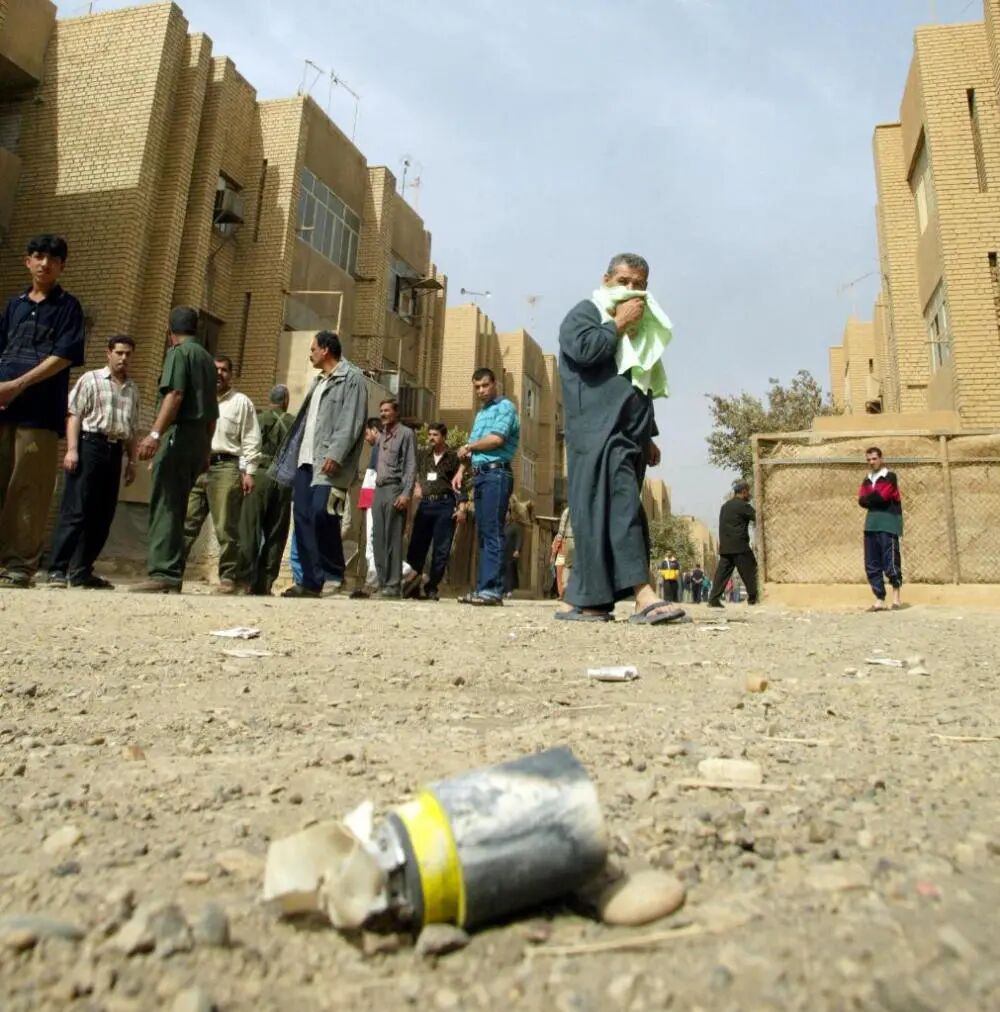 2003年4月5日在伊拉克巴格达南部一个居民区拍摄的照片,人们纷纷绕开一枚集束炸弹的“子炸弹”。