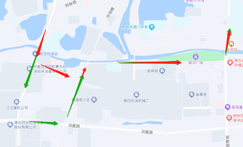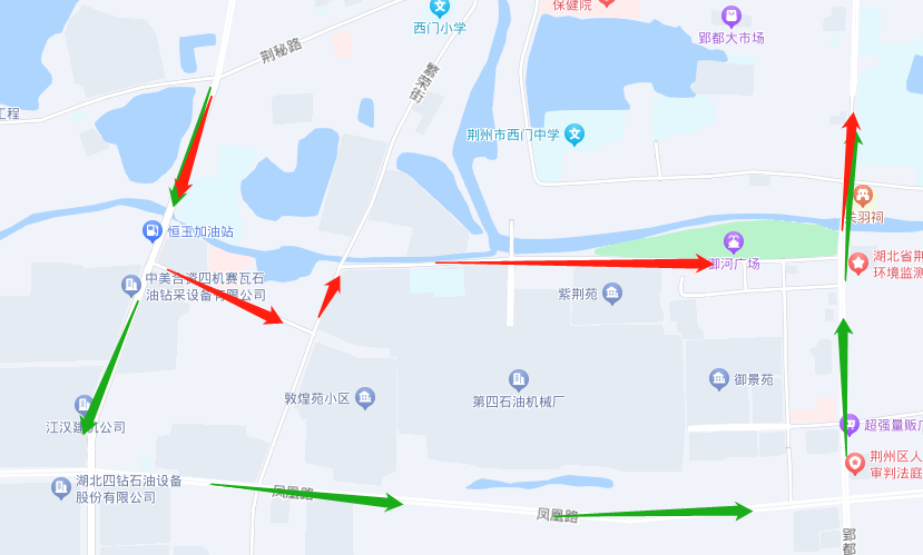 绿色箭头为修路期间行驶路线,红色箭头为原行驶路线。