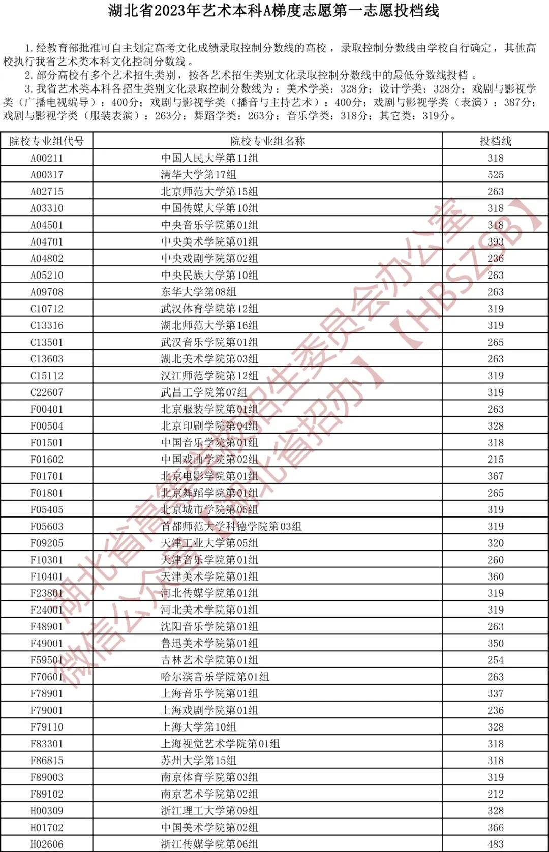 7月10日晚,湖北省招办发布《湖北省2023年艺术本科A梯度志愿第一志愿投档线》、《湖北省2023年本科提前批单设志愿投档线》。