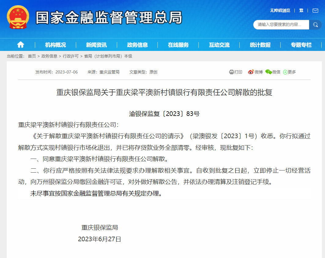 日前,国家金融监督管理总局官网信息显示,重庆银保监局作出关于重庆梁平澳新村镇银行有限责任公司解散的批复,同意该行解散。