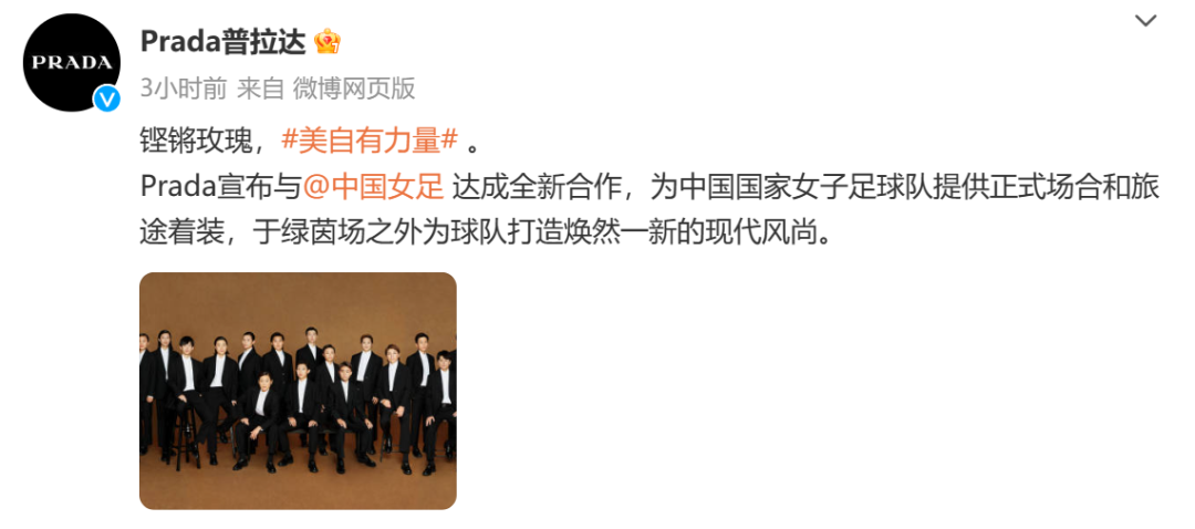 7月10日,中国国家女子足球队与Prada共同宣布,Prada成为中国国家女子足球队官方合作伙伴。Prada将为中国女足国家队提供正装支持,成为中国国家女子足球队官方正装合作伙伴,将于绿茵场外为球队打造焕然一新的现代风尚。