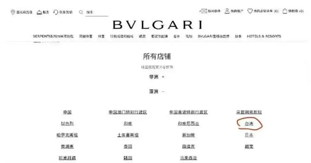 近日,有网友发现,在宝格丽品牌官网的店铺分布信息中,香港澳门前加了“中国”二字,而在台湾前并未加“中国”二字。该行为引发网友质疑,认为宝格丽此举是在将台湾单独列为一个国家。