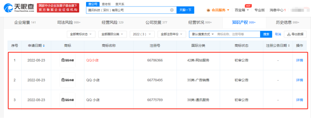 公开资料显示,“QQ 小店”是QQ官方推出的电商带货返佣产品,号称“零成本开店、享百万优质货源、轻松带货赚取佣金福利”。用户通过设置选品后,可以在QQ群、QQ看点、QQ空间等场景推送商品,如商品被他人购买,用户就能获得佣金。值得注意的是,天眼查显示,去年8月,腾讯科技(深圳)有限公司还曾申请注册了多个“QQ小店”商标,国际分类涉及广告销售、通讯服务、网站服务业等,不过从商标申请进度来看,目前均停在了“受理通知书发文”状态。