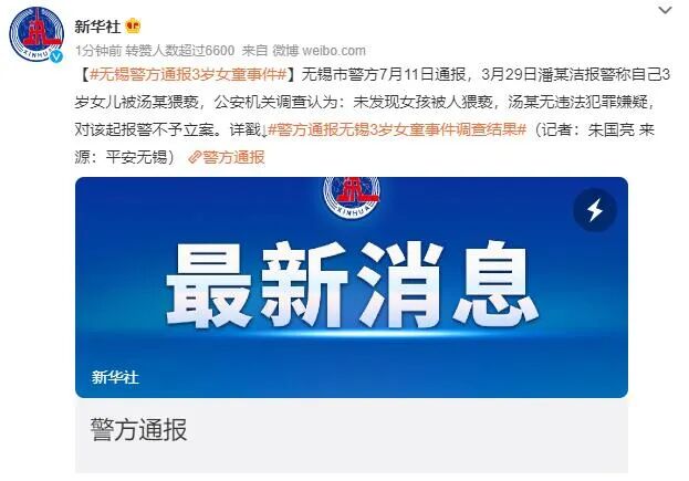7月11日,2023年3月29日9时38分,无锡市公安局110接到潘某洁(女,30岁)报警,称女儿沈某(3岁)被人猥亵,后指控嫌疑人为一蛋糕店店主汤某(男,39岁)。无锡市公安局高度重视,抽调多警种成立联合调查组,提级开展调查处置工作。期间,公安机关多次就调查工作与潘某洁进行通报和沟通。