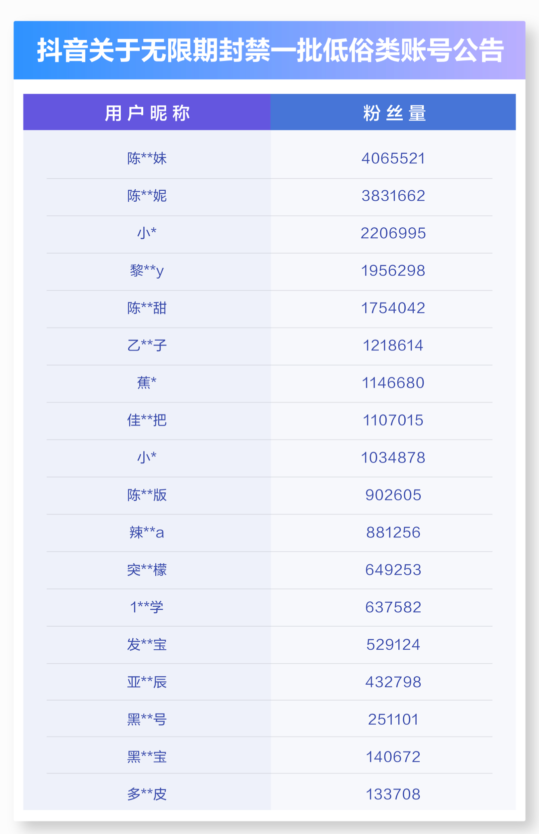 上述行为,严重违反了平台规则,抖音对其进行了严格处置,对“陈**甜”“陈**妮”等22个账号实施了无限期封禁处置,并对其不当获取粉丝进行抹除,取消其直播带货等营利权限。