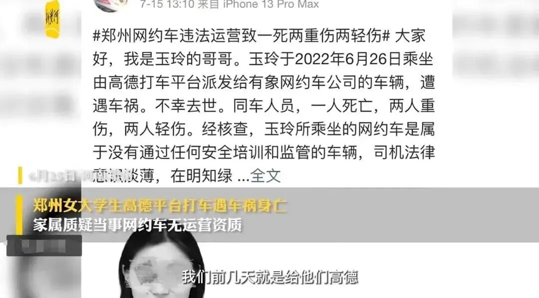据媒体报道,2022年6月26日,郑州女大学生苏同学和朋友在郑州乘坐高德打车派发给有象约车时遭遇车祸,不幸去世。事故源自司机不规范驾驶造成,但相关打车平台明显也未尽监管职责。