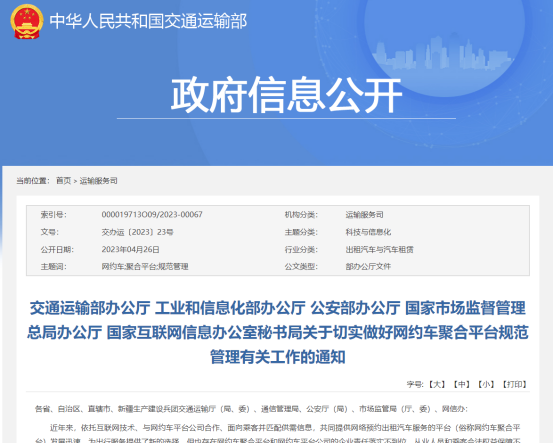 今年4月26日,交通运输部、工信部等五部门联合发布了《关于切实做好网约车聚合平台规范管理有关工作的通知》,系国家层面对网约车聚合平台出台监管政策。