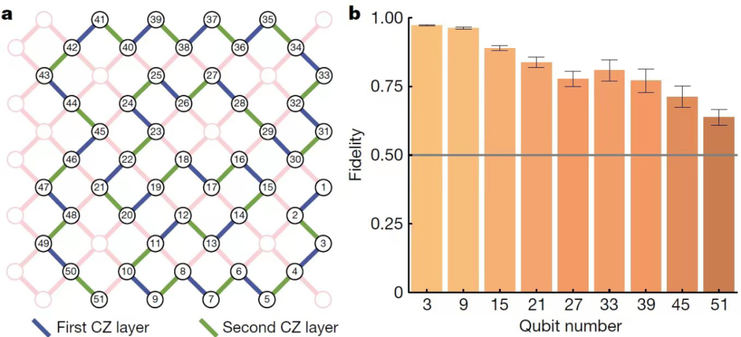 利用“祖冲之二号”完成的51比特一维簇态制备的线路及量子态保真度结果。(研究团队供图)