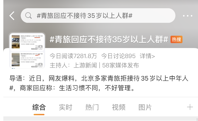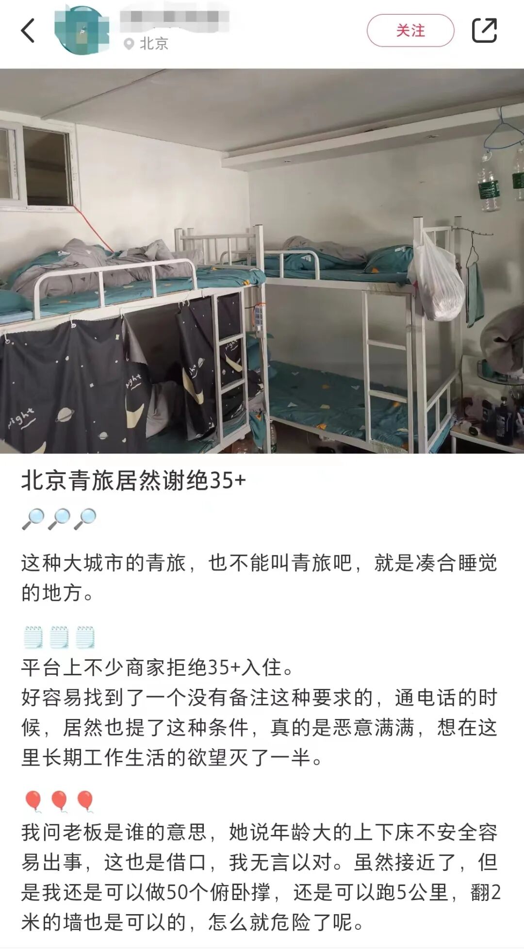 近日,社交平台上一则关于“北京市内多家青旅拒接35岁以上中年人入住”的吐槽帖引发争议。