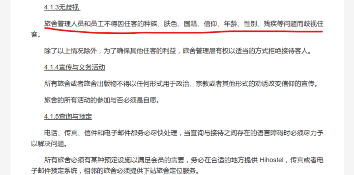 “按照国际青年旅舍联盟章程规定,旅舍向所有认为自己有年轻的心的人士开放,也就是说青年旅舍不能有年龄歧视。”尹忱表示,但同时,旅舍也要求入住青年旅舍的客人要遵守青年旅舍的规则,如文化包容、平等交流、践行环保、顾及他人等等。同时,青年旅舍保留根据客人年龄调整住房安排的权利,如考虑到年龄大的客人起夜不方便,一般会安排带有独立卫生间的单间或标间,不安排上下铺宿舍等等。另外,青年旅舍也有对拒不执行旅舍正常规定,有不良行为的客人不予接待的权利。