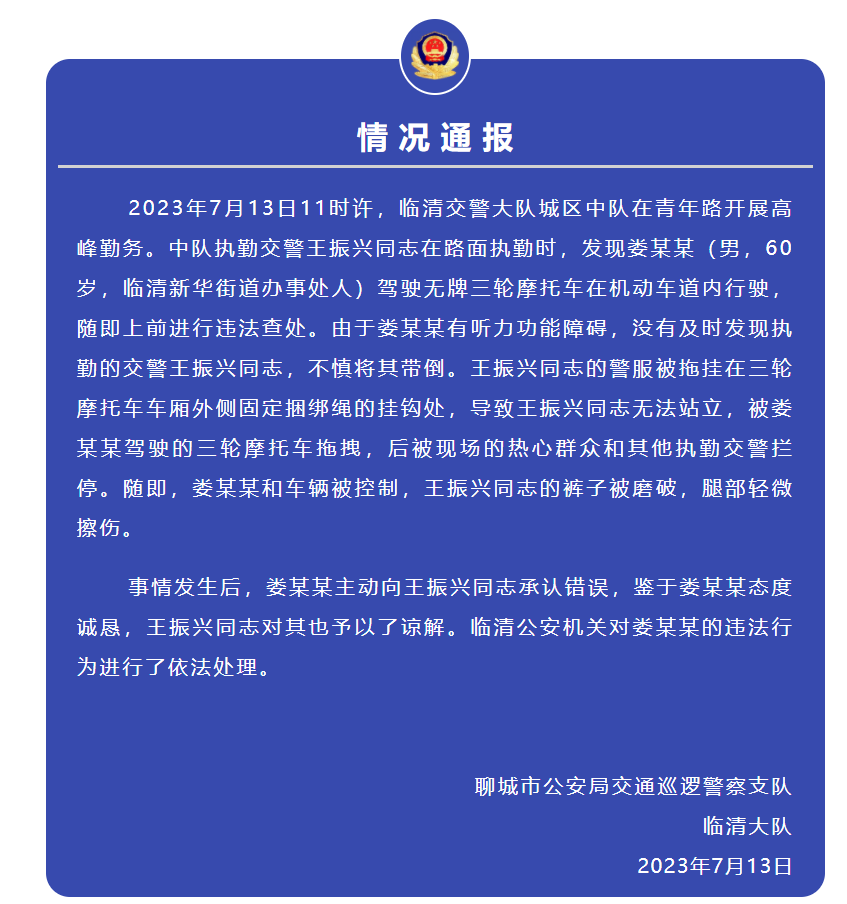 13日,山东聊城临清交警就老人开三轮车拖拽交警一事发布情况通报,全文如下: