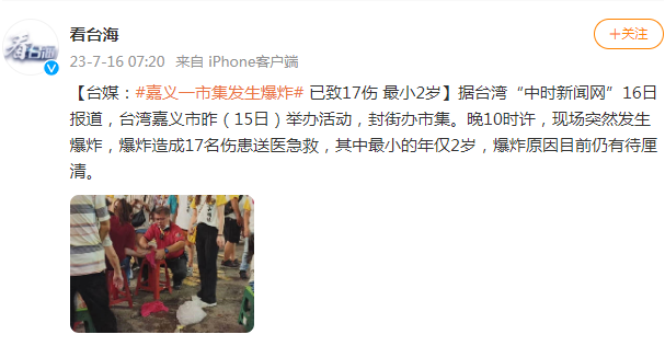 突发爆炸致17伤!最小伤者2岁 2023-07-16 09:12 长江云新闻 0 据台湾“中时新闻网”16日报道,台湾嘉义市昨(15日)举办活动,封街办市集。晚10时许,现场突然发生爆炸,爆炸造成17名伤患送医急救,其中最小的年仅2岁,爆炸原因目前仍有待厘清。