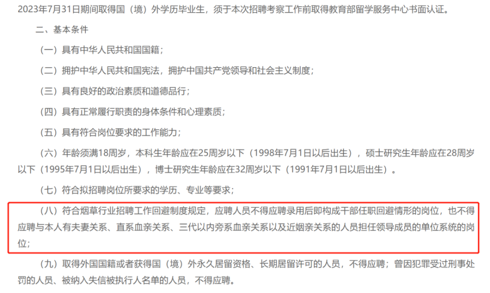 比如青海省烟草专卖局(公司)于7月13日发布的2023年高校毕业生招聘公告,同样明确提出:应聘人员不得报考与本人有夫妻关系、直系血亲关系、三代以内旁系血亲关系以及近姻亲关系的人员所属市州局(公司)相关岗位。应聘人员的直系亲属、三代以内旁系血亲以及近姻亲有在青海烟草系统工作的,报名时须如实说明。故意隐瞒不报的,一经查实,直接取消考试或录用资格;已经录用的,依法解除劳动关系。