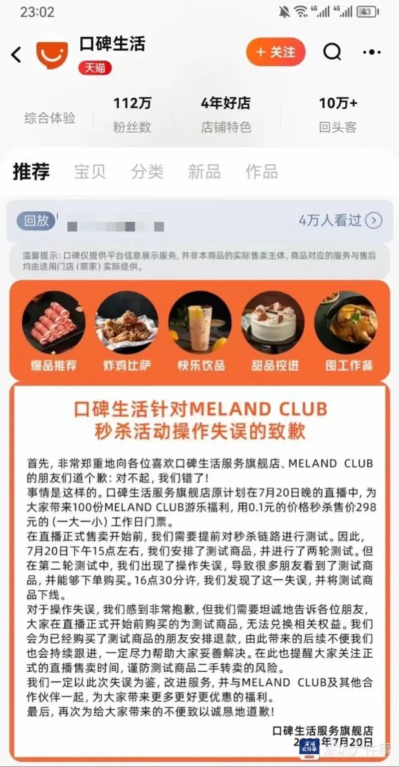 口碑生活致歉随后,口碑生活服务旗舰店在店铺首页贴出致歉信,声称原计划在7月20日晚的直播间设置100份Meland club游乐福利,用0.1元的价格秒杀售价298元的(一大一小)工作日门票。提前对秒杀链路进行测试时,出现了操作失误,导致很多朋友看到了测试商品,并能够下单购买。