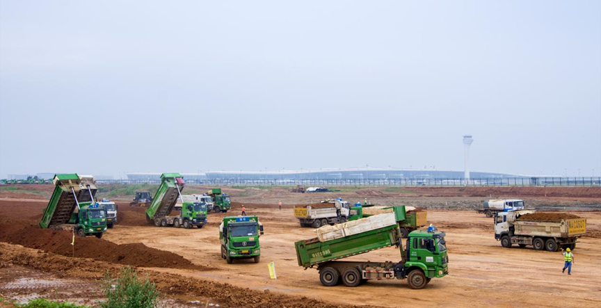 在武汉天河机场第三跑道工程建设现场,360余名建设者,连同挖掘机、推土机、压路机、渣土车等各类设备近240台同时作业,为项目按下“加速键”确保工程如期“交作业”。