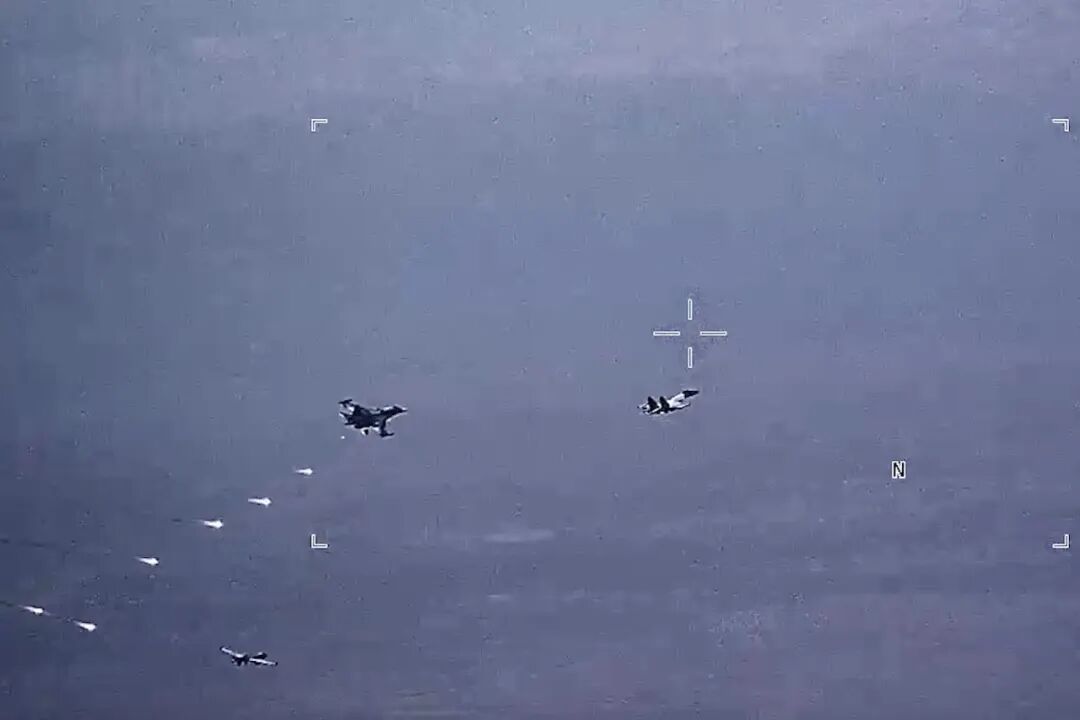当地时间2023年7月6日,叙利亚,俄罗斯军用苏-34和苏-35飞机在美军MQ-9“死神”无人机的飞行路径上发射照明弹(左下)。(视觉中国)
